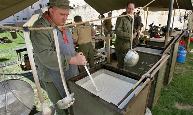 Ve štábu důstojník sepisuje denní hlášení, kuchaři v polní kuchyni vaří oběd pro celou jednotku, která před jídlem provede hygienu v polních umývárnách. O pořádek se stará vojenská policie.