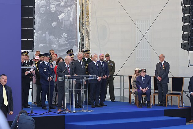 Pietního aktu u památníku Díky, Ameriko! v Plzni se účastnil prezident Petr Pavel a belgický král Philippe. (6. května 2025)