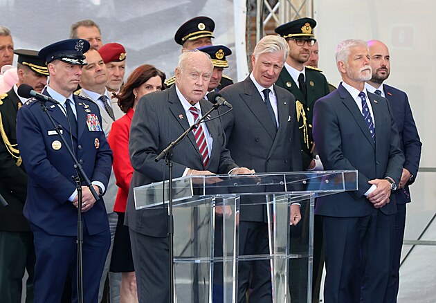 Pietní akt u památníku Díky, Ameriko! za účasti prezidenta Petra Pavla a krále Belgičanů Filipa. (6. května 2025)