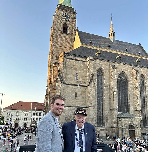 Jiří Klůc s 99letým válečným veteránem Harry Humasonem na náměstí Republiky v Plzni
