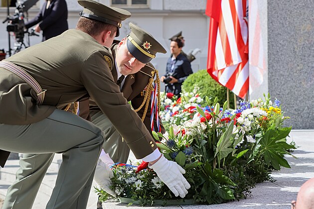 Pietní akt u památníku Díky, Ameriko! za účasti prezidenta Petra Pavla a krále Belgičanů Filipa. (6. května 2025)