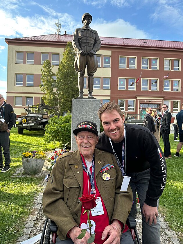 Válečný veterán se účastnil také pietního aktu u sochy generála Pattona v Dýšiné u Plzně.