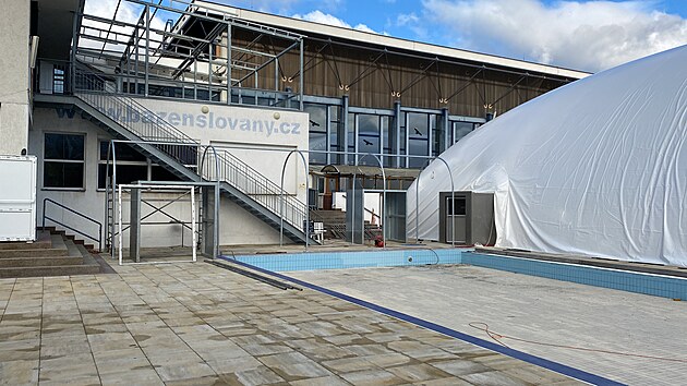 Venkovní bazén v Plzni na Slovanech zakryla nafukovací hala. Plavcům začne sloužit v polovině prosince. (29. listopadu 2024)