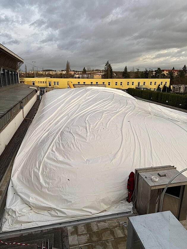 Snímek z nafukování haly nad venkovním bazénem v Plzni na Slovanech