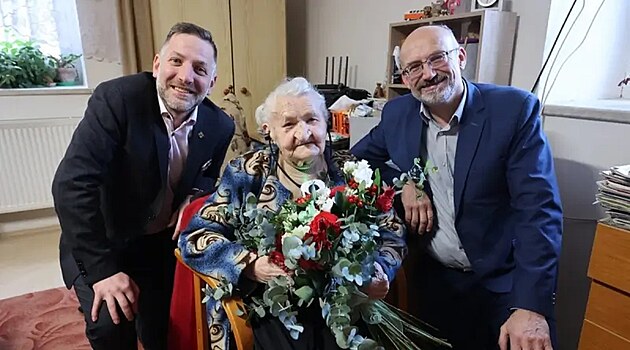 Marie Špetová byla nejstarší obyvatelkou Plzeňského kraje. Na snímku z roku 2023, kdy oslavila 106. narozeniny. Poblahopřát jí přijel tehdejší hejtman Rudolf Špoták (vlevo) a náměstek hejtmana pro dopravu Pavel Čížek.