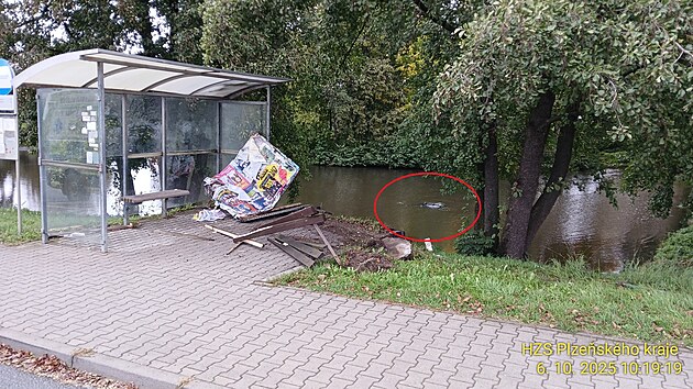 Starší řidič projel kolem autobusové zastávky a skončil s autem v rybníce. Vozidlo nebylo téměř vidět, celé se ponořilo do vody. (6. října 2025)