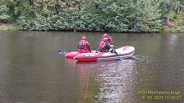 Potopené auto musí znovu dostat na suchou zem hasiči. (6. října 2025)