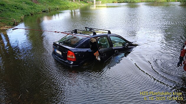 Potopený opel vyprostili z rybníka hasiči pomocí hasičského speciálu. (6. října 2025)