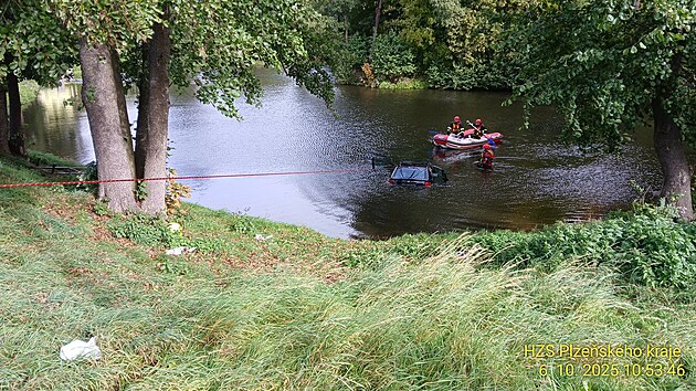Potopený opel vyprostili z rybníka hasiči pomocí hasičského speciálu. (6. října 2025)
