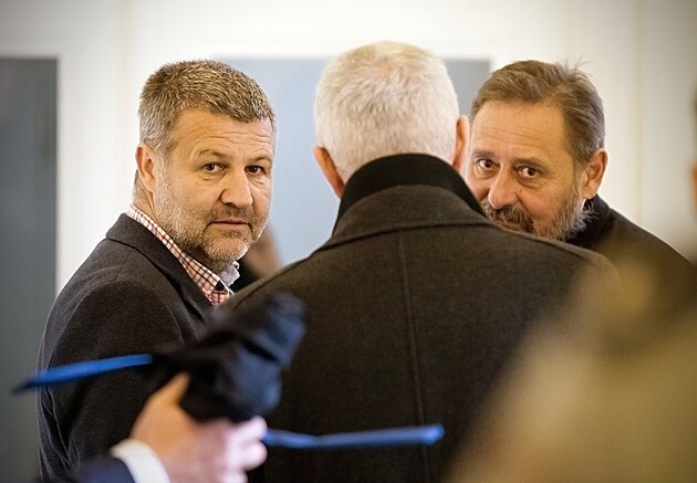 Obžalovaný Michal Káník (vlevo) dorazil k plzeňskému okresnímu soudu vypovídat v kauze údajné fotbalové korupce okolo Romana Berbra.
