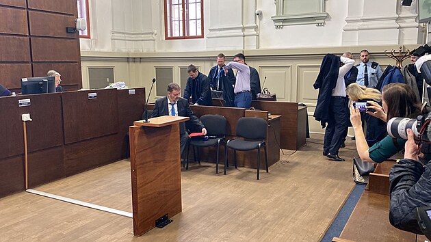 Druhý den u soudu. Bývalý fotbalový boss Roman Berbr v soudní síni. Dnes bude vypovídat. Na dotazy novinářů, kteří ho doprovázeli do soudní síně, nereagoval. (18. dubna 2023)