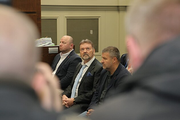 Bývalý předseda Fotbalové asociace ČR Roman Berbr (uprostřed) u Okresního soudu Plzeň-město. Vedle něj vpravo na snímku sedí bývalý prvoligový hráč Michal Káník, vlevo někdejší rozhodčí Tomáš Grímm. (17. dubna 2023)