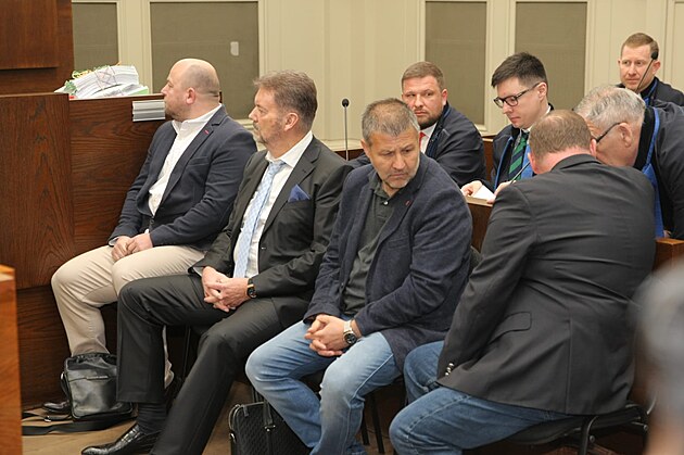 Bývalý předseda Fotbalové asociace ČR Roman Berbr (uprostřed) u Okresního soudu Plzeň-město. Vedle něj vpravo sedí bývalý prvoligový hráč Michal Káník. (17. dubna 2023)