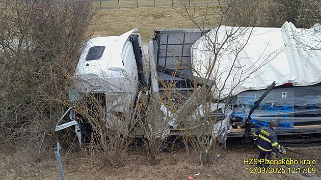 Nehoda dvou kamionů zastavila provoz mezi Černicemi a Štěnovicemi. Jeden z vozů skončil v příkopu. (12. března 2025)