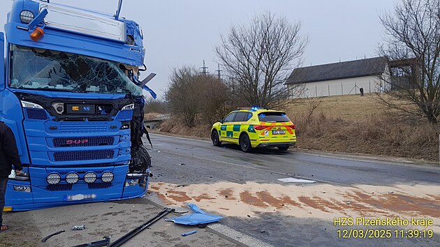 Nehoda dvou kamionů zastavila provoz mezi Černicemi a Štěnovicemi. Jeden z vozů skončil v příkopu. (12. března 2025)