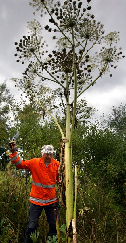 Sekáč bolševníku Martin Klepal ve čtvrtek likvidoval plevel v Sítinách u Mnichova ve Slavkovském lese.