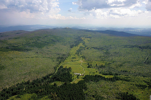 Na snímku samota Březník nedaleko Modravy, cesta na bývalý přechod Modrý sloup a v pozadí vrchol Luzný (1375 m n. m.). Letecký pohled
