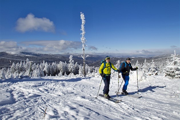 Skialpinisté na Šumavě, výhled z hory Pancíř na Železnorudskuna hraniční hřeben se Špičákem, Jezerní horou, kotlem Černého jezera a Malým a Velkým Ostrým. (13. února 2021)