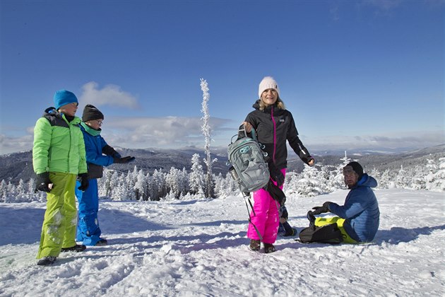 Výhled z hory Pancíř na Železnorudskuna hraniční hřeben se Špičákem, Jezerní horou, kotlem Černého jezera a Malým a Velkým Ostrým. (13. února 2021)