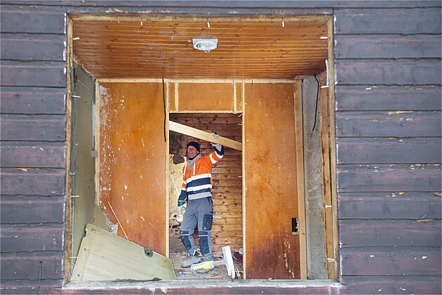 Na Špičáku začala demontáží vnitřního vybavení demolice bývalé točny vleku. Místo ní vyroste restaurace, která pojme až 250 hostů. (4. dubna 2022)