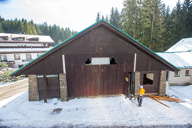 Na Špičáku začala demontáží vnitřního vybavení demolice bývalé točny vleku. Místo ní vyroste restaurace, která pojme až 250 hostů. (4. dubna 2022)