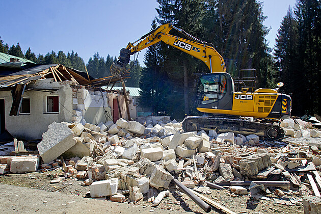 V šumavském areálu Ski&Bike Špičák začala těžká technika demolovat strojovnu vleku Transporta z roku 1972. Na jejím místě vyroste moderní objekt s velkou restaurací, půjčovnou a servisem vybavení a také s několika byty. (11. dubna 2022)