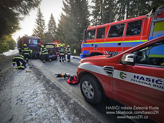 Vážná nehoda se stala v pátek ráno na Źeleznorudsku. Řidič u Nové Hůrky přejel do protisměru a zapasoval auto pod kabinu nákladního vozidla. Je vážně zraněný. (21. února 2025)
