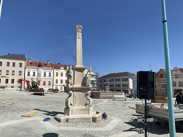 Opravené náměstí v Tachově má po půl století opět mariánský sloup. Zřízenci města usadili s pomocí jeřábu na vrchol sloupu sochu Panny Marie. Jeho rekonstrukce je dílem sochaře Jaroslava Šindeláře mladšího. (20. června 2025)