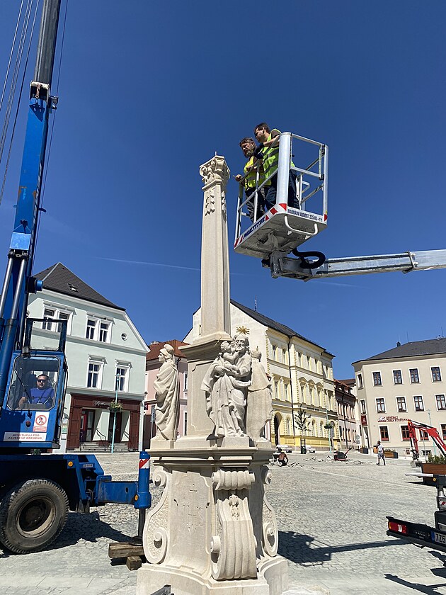 Opravené náměstí v Tachově má po půl století opět mariánský sloup. Zřízenci města usadili s pomocí jeřábu na vrchol sloupu sochu Panny Marie. Jeho rekonstrukce je dílem sochaře Jaroslava Šindeláře mladšího. (20. června 2025)