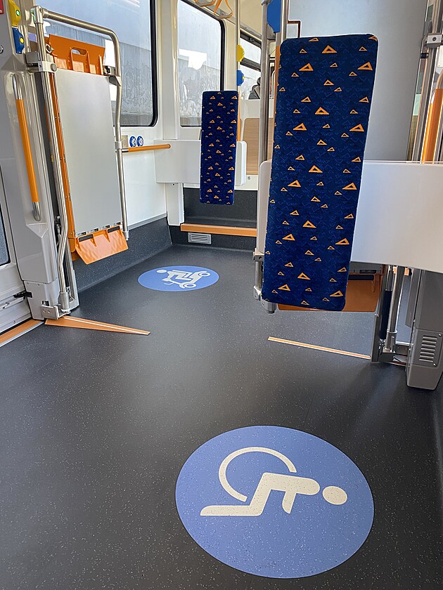 Kromě míst pro kočárky a klasické invalidní vozíky jsou v tramvaji vyhražená místa i pro lidi, kteří se pohybují v elektrických vozících. Každá z těchto kategorií cestujících má vlastní tlačítko, kterým dá řidiči vědět, že chce vystupovat. (18. března 2025)