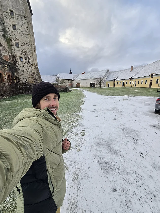 Richard Brož ze spolku WeLoveŠumava, který natočil místa, kde se před 51 lety natáčely Tři oříšky pro Popelku. Na snímku stojí v areálu vodního hradu Švihov.