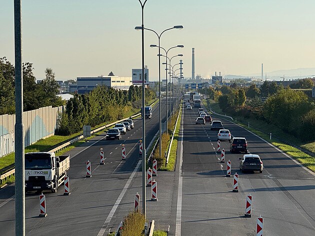 Příjezd k přestavěnému kruhovému objezdu na Borských polích ve směru od Sulkova. Kolony se tam v pondělí kolem osmé hodiny ráno netvořily. (29. září 2025)