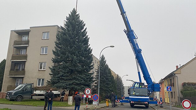 Plzeňským vánočním stromem je stříbrná varianta smrku pichlavého. V Doubravce rostl padesát let. (11. listopadu 2024)