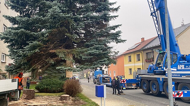 Plzeňským vánočním stromem je stříbrná varianta smrku pichlavého. V Doubravce rostl padesát let. (11. listopadu 2024)