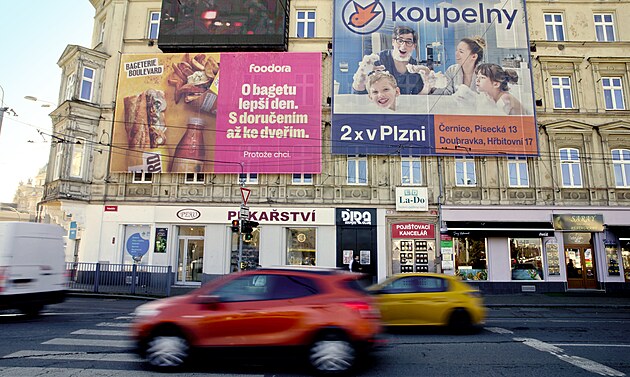 Plzeňská radnice oznámila, že chce bojovat s vizuálním smogem. Na snímku reklamou přeplácané Palackého náměstí v centru Plzně. (5. ledna 2025)