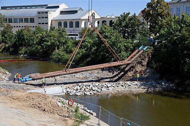Specializované firmy ukládají pod dno řeky Radbuzy v centru Plzně nové trubky vodovodního řadu. Jde o dvojici trubek o průměru 400 mm v ochranném potrubí. (12. srpna 2025)