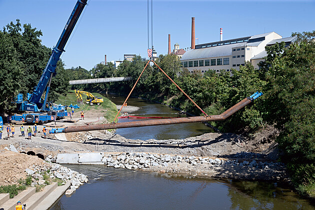Specializované firmy ukládají pod dno řeky Radbuzy v centru Plzně nové trubky vodovodního řadu. Jde o dvojici trubek o průměru 400 mm v ochranném potrubí. (12. srpna 2025)