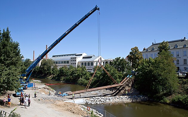 Specializované firmy ukládají pod dno řeky Radbuzy v centru Plzně nové trubky vodovodního řadu. Jde o dvojici trubek o průměru 400 mm v ochranném potrubí. (12. srpna 2025)
