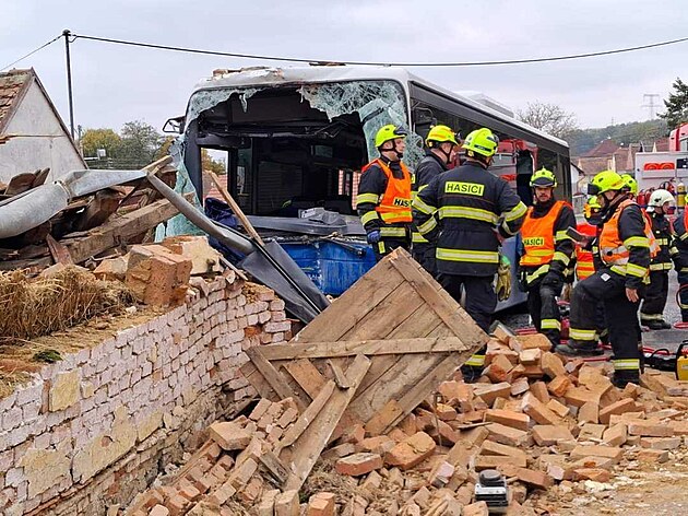 V obci Vodokrty na Plzeňsku narazil autobus do stodoly. (26. října 2024)