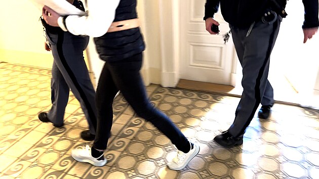 Eskorta odvádí ženu obžalovanou z vraždy exmanžela