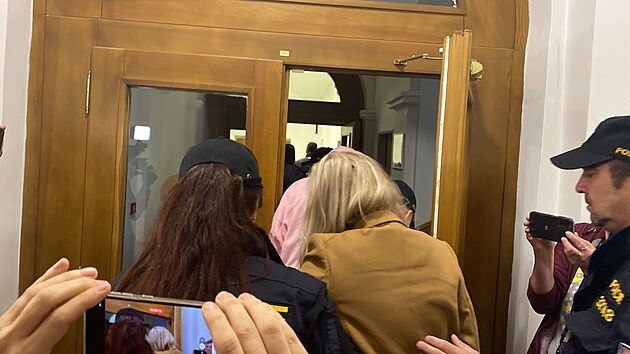 Trojice obviněných z vraždy starosty u Okresního soudu v Tachově. Spolu se dvěma muži je to také žena. (20. října 2023)