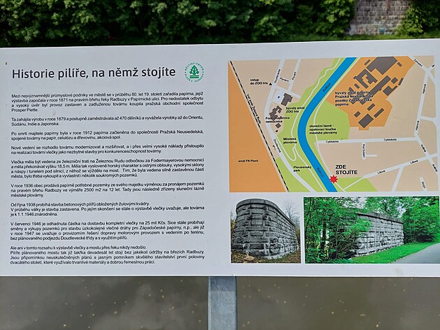 Pilíř u řeky Radbuzy v Plzni se proměnil ve vyhlídkovou plošinu. Jsou na ní informační cedule. (5. 6. 2023)