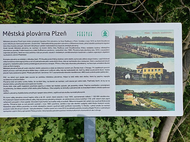 Pilíř u řeky Radbuzy v Plzni se proměnil ve vyhlídkovou plošinu. Jsou na ní informační cedule. (5. 6. 2023)