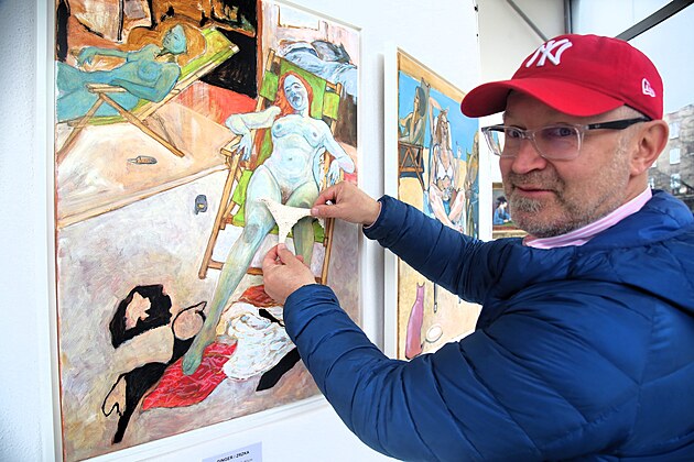 Jiří Boudník vystavuje své akty v plzeňské galerii na Slovanech. Jeden z obrazů po kritice z radnice poupravil, slečně zakryl intimní partie pásem cudnosti.