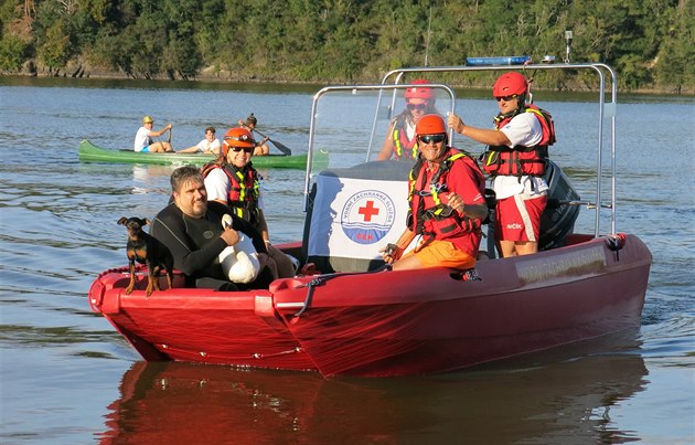 Bohouš Ježdík se zraněnou labutí ve člunu hracholuské vodní záchranné služby (23. srpna 2016)