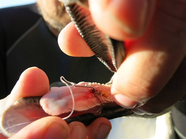 Rybářský háček zaseknutý do jazyku labutě (23. srpna 2016)
