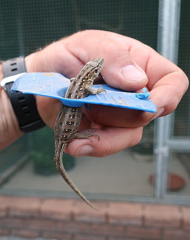 Ještěrka uvázla v otvoru plastové nádoby a nemohla ven. Na svobodu jí pomohl Karel Makoň ze Záchranné stanice živočichů v Plzni.