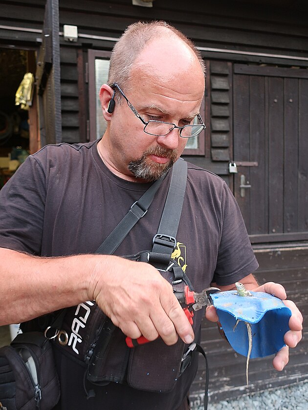 Ještěrka uvázla v otvoru plastové nádoby a nemohla ven. Na svobodu jí pomohl Karel Makoň ze Záchranné stanice živočichů v Plzni.