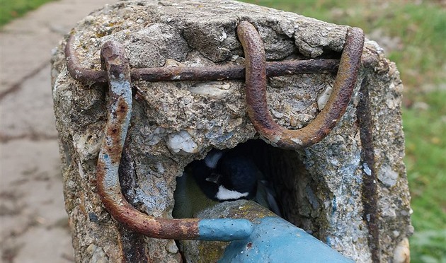 Během hodiny se šéf záchranné stanice Karel Makoň objevil u zvětralého betonového sloupku, kde sýkora koňadra nedobrovolně skončila.