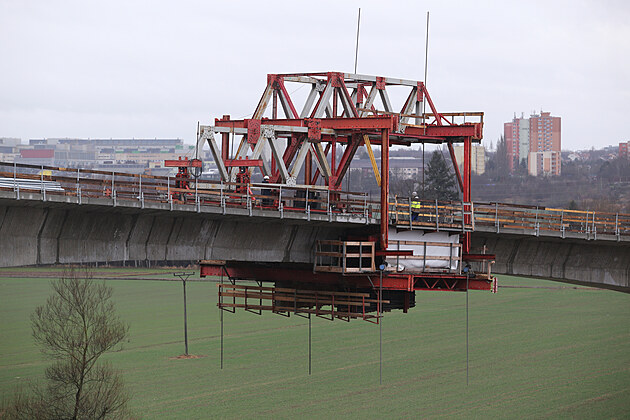 Stavbaři dokončují budování nosné konstrukce mostu přes údolí řeky Mže na západním obchvatu Plzně. (4. 1. 2022)